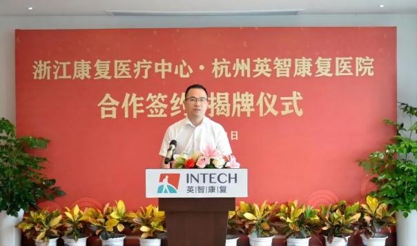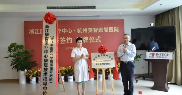康复中心执行院长叶卫江与杭州英智康复医院院长王玉红代表双方签订合作协议,并共同揭牌。