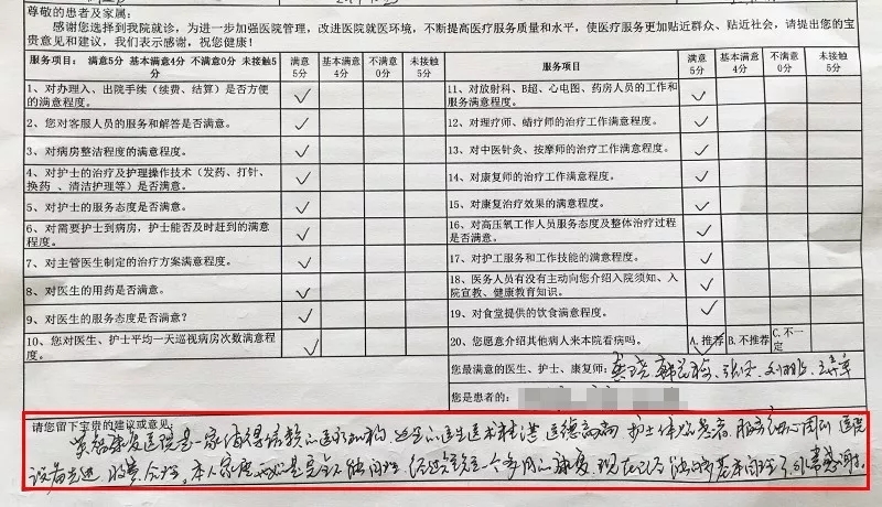 我院患者胡阿姨康复出院,其家属在出院患者/患者家属满意度调查表上留下了这段深情的“告白”,以表达我院全体医护人员胡阿姨的精心治疗和贴心照顾。