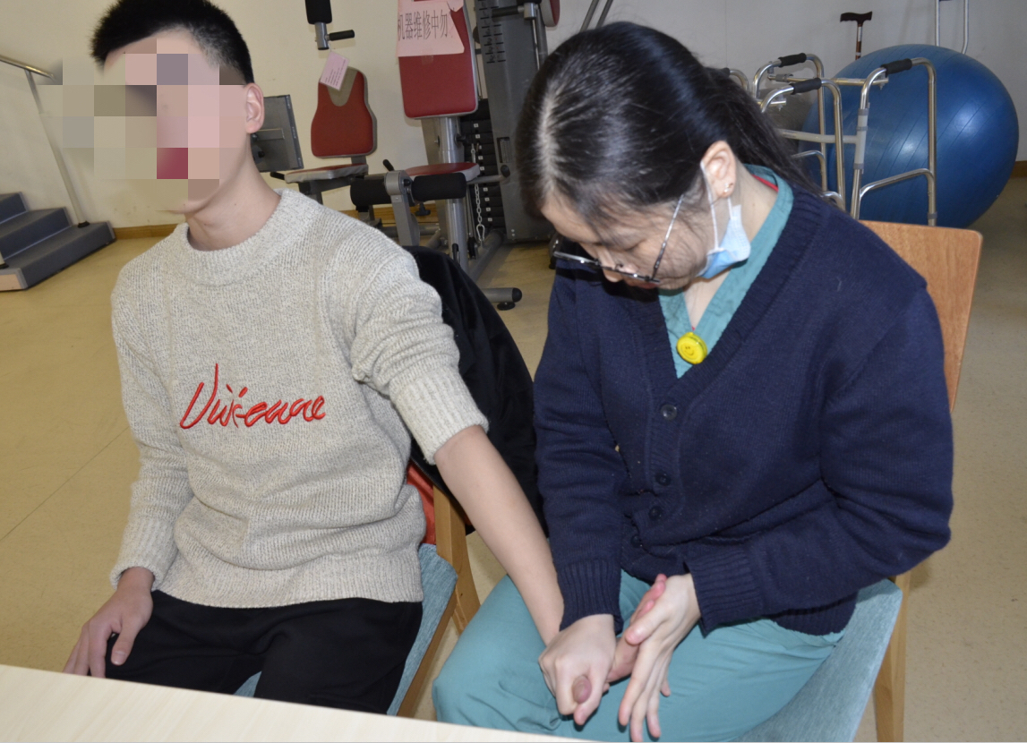 在排除禁忌后于2017年9月29日在全麻下行C1-6脊髓髓内肿瘤切除术,患者手术范围较大,术后转脑重症科加强康复治疗。于2017年10月12日转我院进行康复治疗,入院时患者左、右上肢均感觉障碍,无法感知左手中是否有物品,右手无法感知物品形状;不能单独坐起及翻身,可下床行走,双下肢行走有踩棉花感;左上肢不能上举过肩,右上肢无法负重上举过头;左上肢协调控制能力差,无法将粗木钉插入槽内。