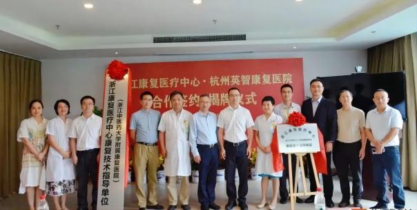 康复中心执行院长叶卫江与杭州英智康复医院院长王玉红代表双方签订合作协议,并共同揭牌。